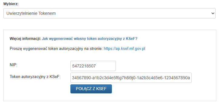 W polu NIP podajemy NIP swojej firmy, a w polu Token autoryzacyjny z KSeF wklejamy token, który wygenerowaliśmy w KSeF.
